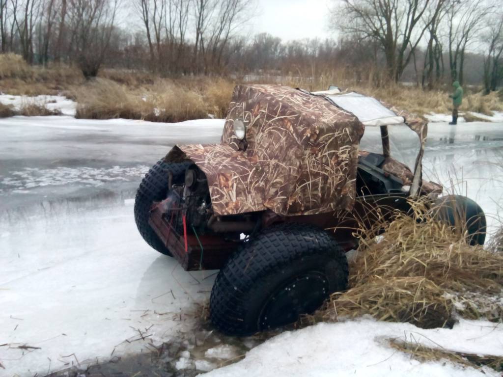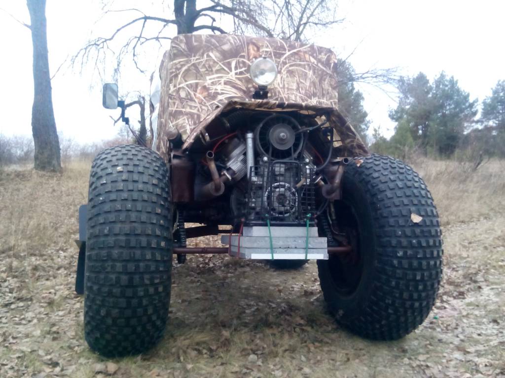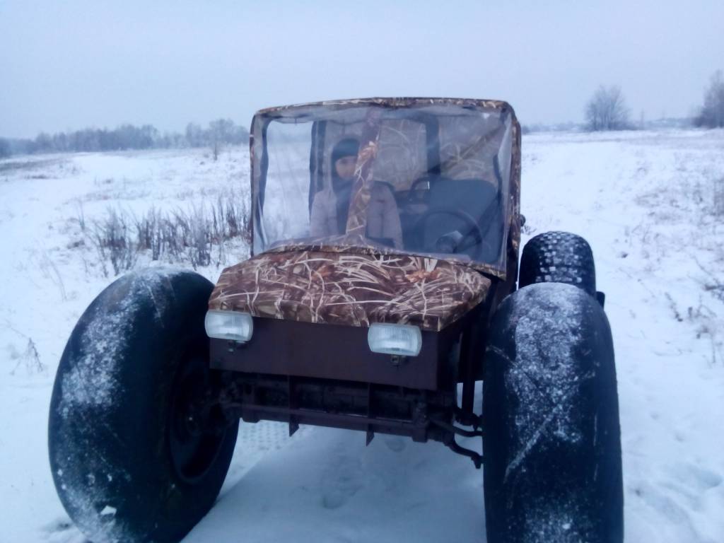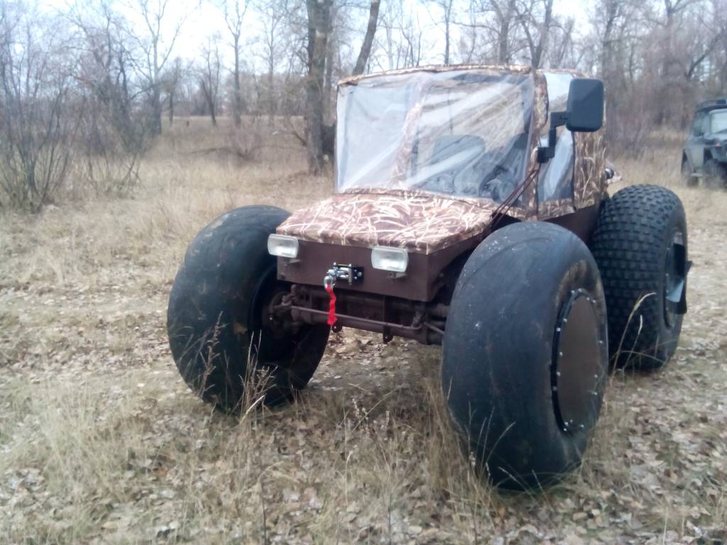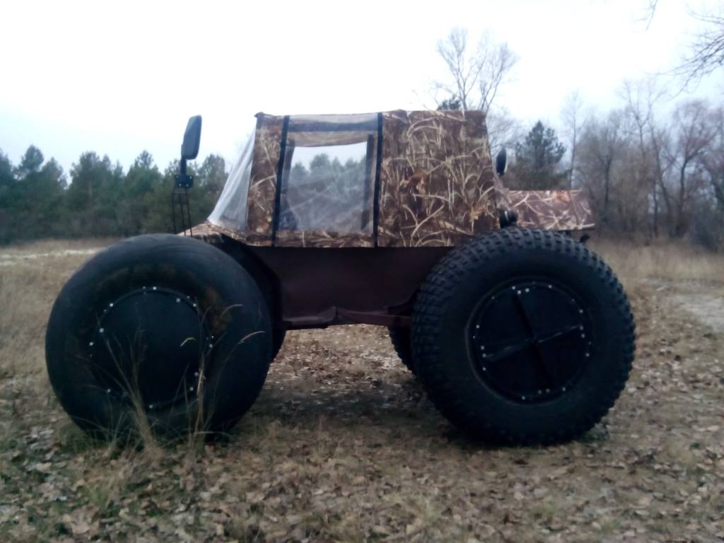 Я указал и вес 750 кг и размер шин 1220/400/533 это от Урала 4320 из двух колёс сделано 4 . Вырваны внутренности на передок а наружние слои нарезаны регрувером на гребучий задок .Понятно , что в его проходимости есть предел из-за отсутствия переднего моста , но из-за низкого удельного веса на грунт и пониженного ряда 1/4 ( возможно на третьей передаче ехать 6-7 км/ч.) едет он настолько ярко , что я и не ожидал .Видео есть много - но оно разрознено - как скомпоную - выложу . Спасибо за комменты - у нас в стране эта тема не развита поэтому приятно что кому-то интересно .Молодца, а какой вес его? Моторчика от Запора хватает, думаю летом ему тяжковато будет.