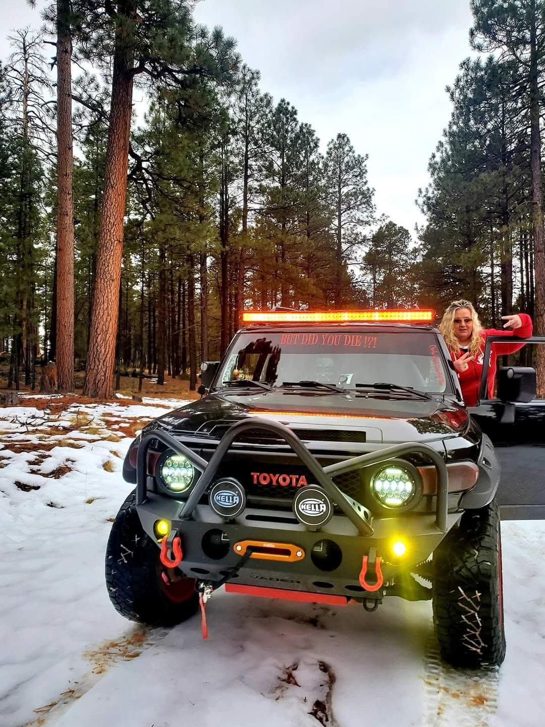 Особенность «внедорожной» версии Woodland — другая оптика с жёлтыми секциями дневных ходовых огней и прямоугольными светодиодами Rigid Industries в бампере, мощные рейлинги на крыше, практичный неокрашенный пластик не только по периметру кузова, но и на бамперах, «зубастые» шины и увеличенный на 13 миллиметров дорожный просвет. Полный привод для такой Toyota RAV4 обязателен.