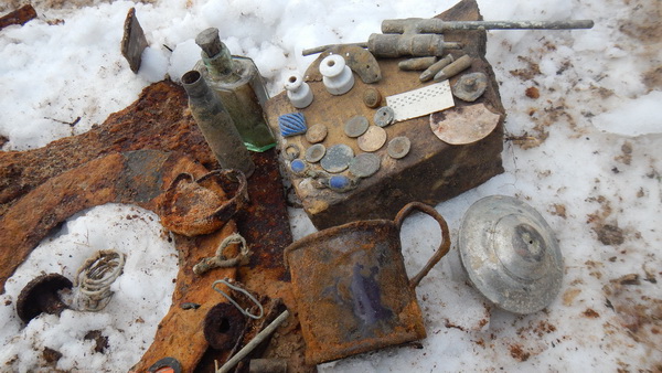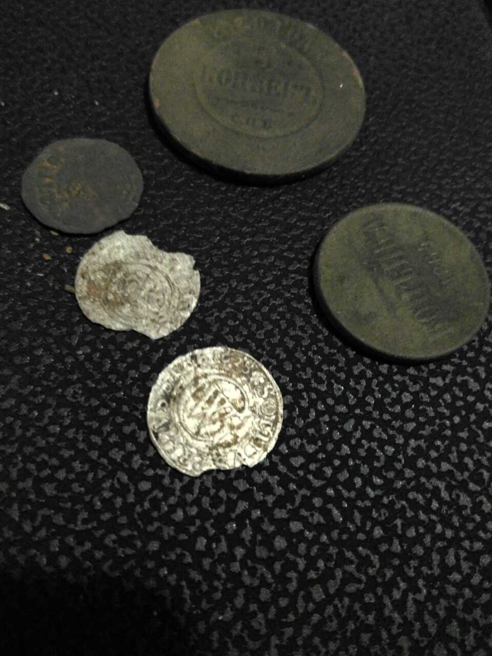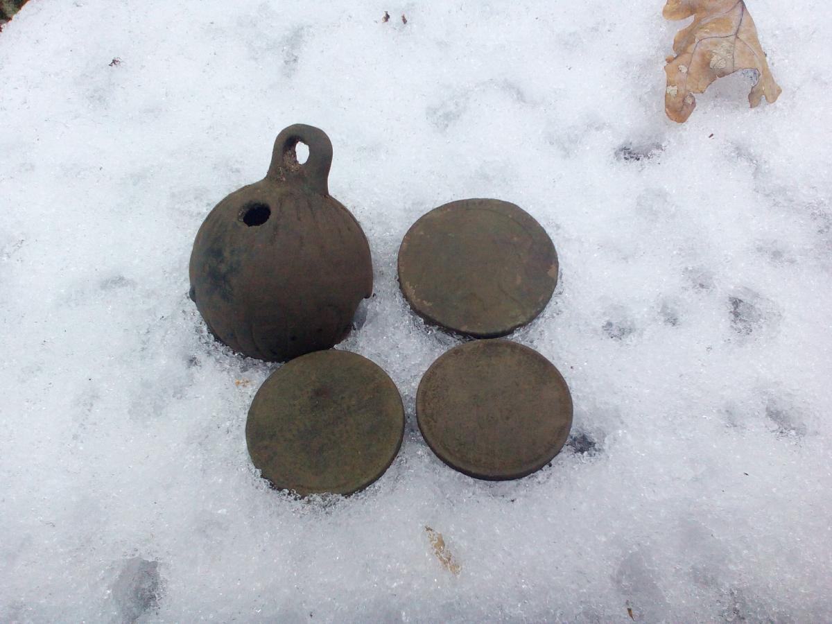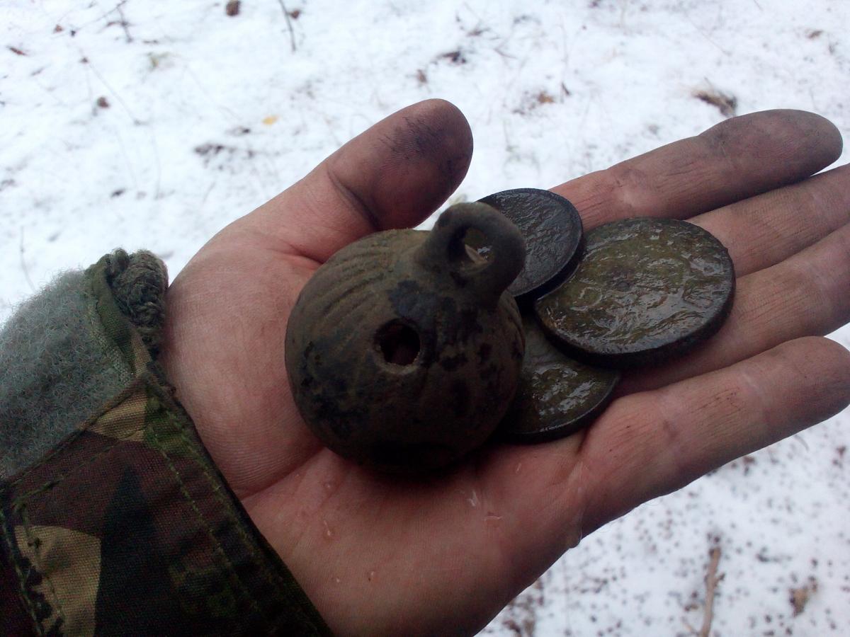 В лесу было классно , ну а несколько пятаков ( 1765 и 1863 - 4 годов ) , да несколько солидов и еще медяков 19 века... ну и бубенчик , размером с елочный шарик ))))