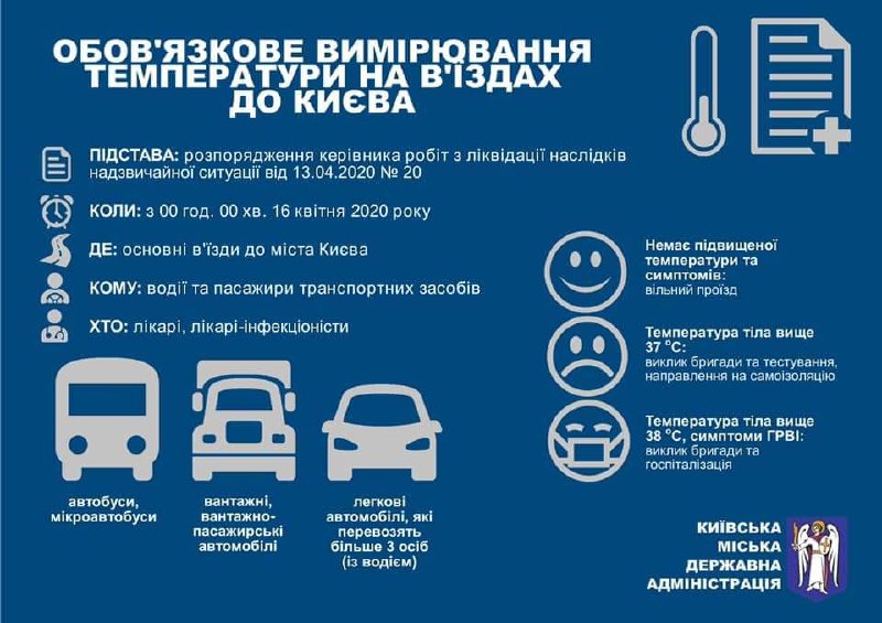 «Хочу отметить, что с четверга, 16 апреля, в следующий понедельник мы усиливаем контроль на постах, выставленных на въездах в Киев. В частности, вводится обязательное измерение температуры для пассажиров транспорта, следующего в столицу. Это касается автобусов, погрузочно-пассажирского и легкового транспорта, перевозящего более трех пассажиров (включая водителя)»-Сообщил Виталий Кличко.