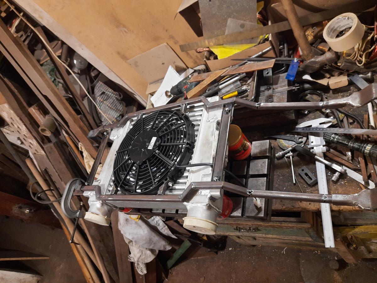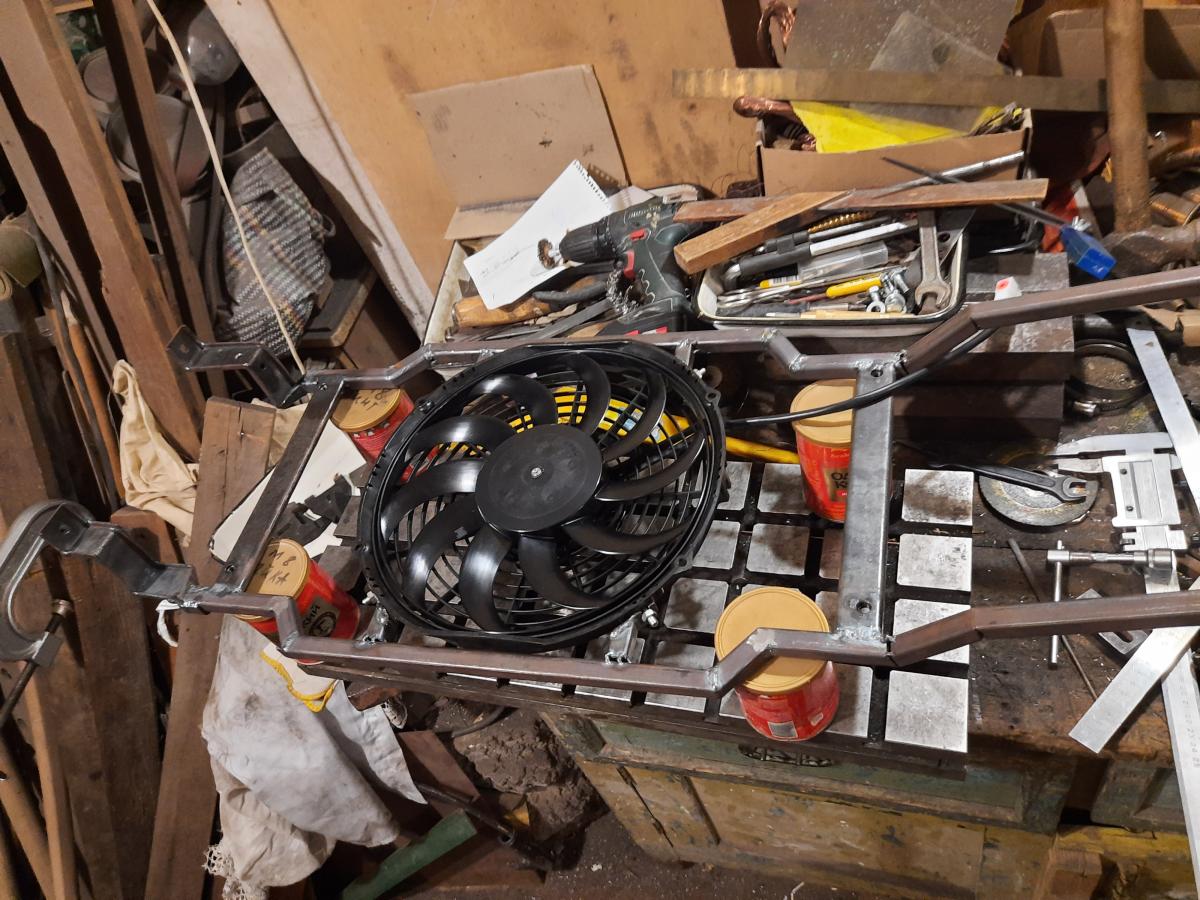 Интеркулер ПАЗ, вентилятор SPAL на втягивание. Сварено из квадратной трубы 15х15 и листового металла 2 мм. Варил тигом.